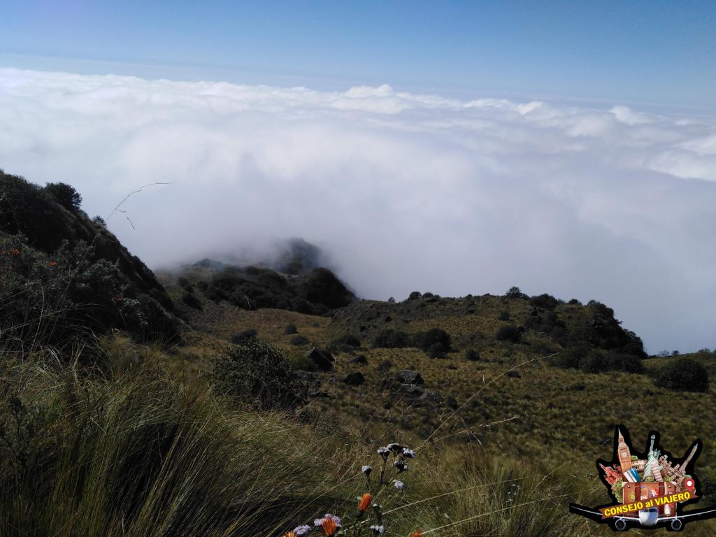 Inmersos ya de pleno en la ladera sur del cerro, las nubes comienzan a subir desde el sur, y por momentos el paisaje amenaza con volverse lúgubre. Esta situación va a ser una constante, entre la aparición de nubes de mayor o menor porte que tapan tanto el camino recorrido como la cima, para luego disiparse y pocos minutos después volver a aparecer. De igual forma, en esta ocasión, van a ser muchas más las veces donde el cielo esté no solo despejado, sino que además, nos abrace el sol durante al menos toda la subida.