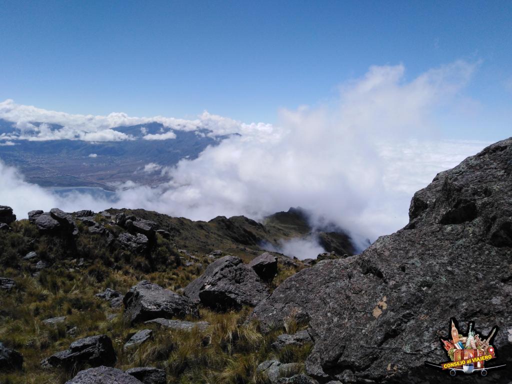 Minutos después finalmente se llega al cúmulo de grandes rocas, donde está instalada la antena. Finalmente, cruzando la misma, aparece el monolito. Luego de un poco más de 6 horas de constante subida, es momento de descansar unos minutos, llega el tiempo de apreciar la espectacularidad del paisaje con una visión de 360°. Desde una vista invaluable del valle, que luego será tapada por el océano de nubes, reconociendo los cerros y cordones montañosos que nos rodean hasta la posibilidad de ver a lo lejos el nevado del Aconquija.