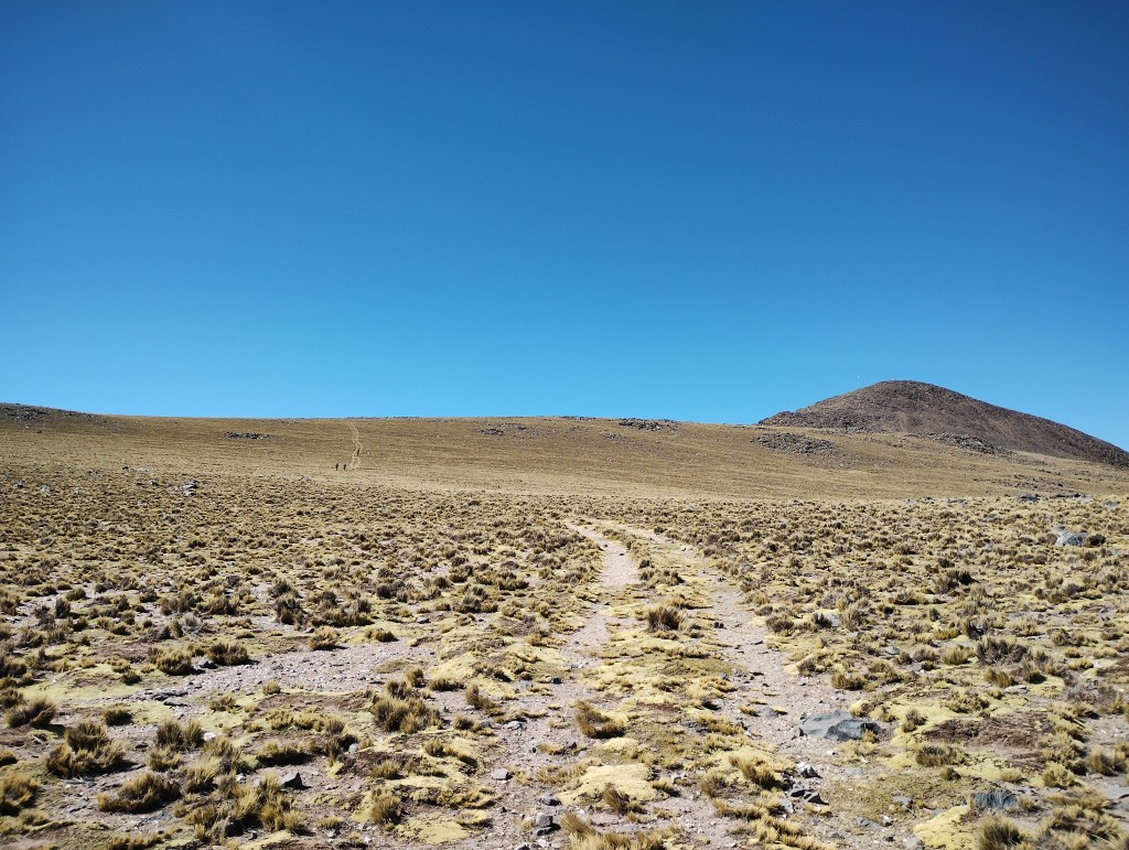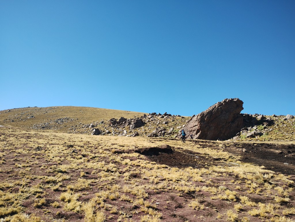 Pasando el arenal empieza una gran explanada que dará lugar a la pre-cumbre. En este momento aparece una sensación de dolor y pesadez en la parte posterior de la cabeza, arriba de la nuca. Tal cual como me lo habían dicho. Lo único que espero es que no se sume el mareo o nauseas. El paso no deja de ser lento, pero tampoco deja de ser constante. Solo freno un par de veces para sacar una foto o tomar agua. En este momento las conversaciones son casi nulas. Todos los caminantes concentran, al parecer, sus energías en caminar y respirar. En mi caso, no dejan de aparecerme situaciones y reflexiones existencialistas/filosóficas. No sé si es algo que les pasa a todas las personas en pleno trekking.