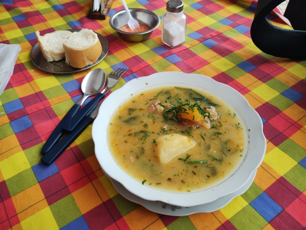 Luego de comprar el pasaje a Santa cruz  camino hasta la plaza 12 de agosto que es la principal en Yacuiba. En la esquina de la plaza consigo un Menú por 13 bolivianos (no incluye la bebida): sopa de Chaira con lampreado de panza más guarnición.