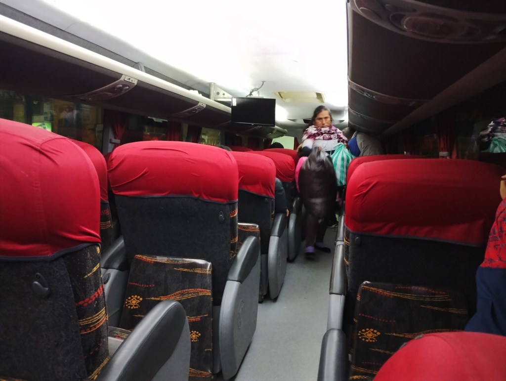 Viajo por la flota Bolivar. El pasaje me duele 100 bolivianos y es servicio “leito” que en ese momento pensé que significaba directo sin embargo me dijeron que es el nombre del servicio: coche cama y solo tres filas de asientos. Por suerte puedo elegir una butaca de la fila con asientos individuales. Sale con 10 minutos de retraso (esperable). Me dicen que tiene puerto USB en cada butaca para cargar celular. Obvio el de mi asiento no funciona.