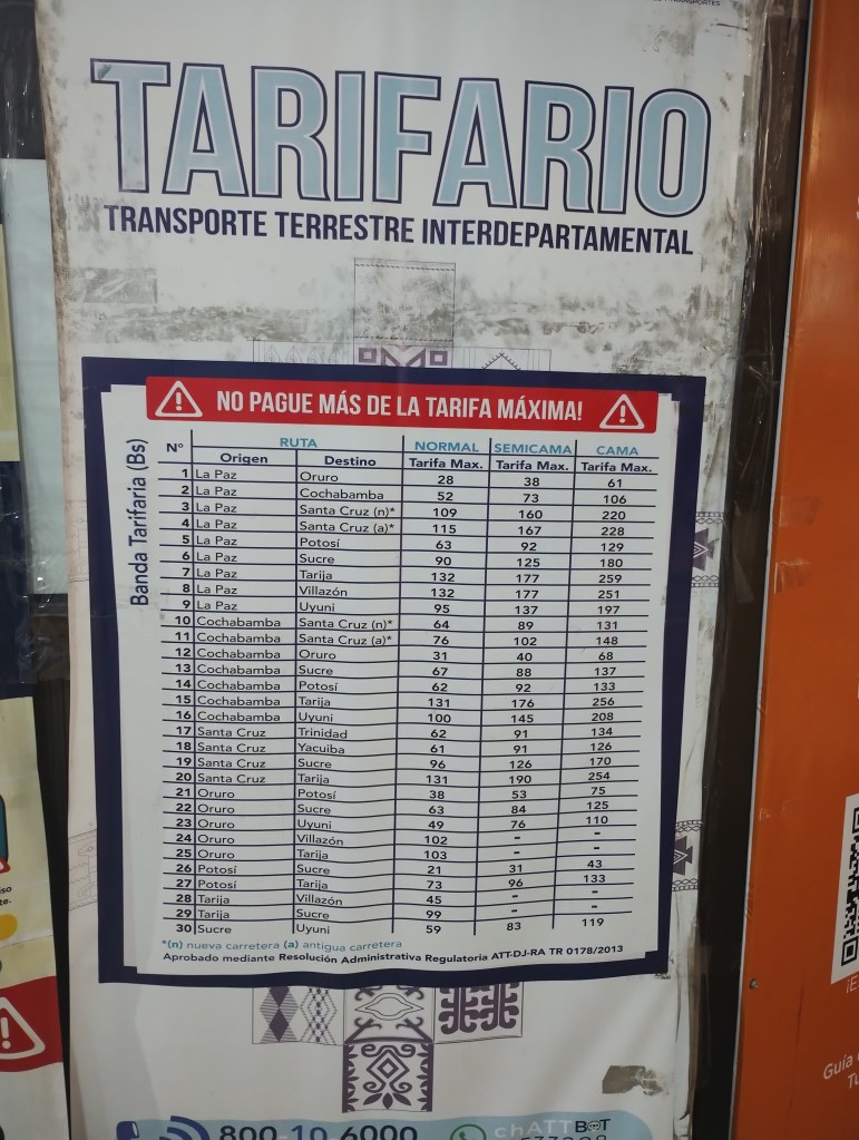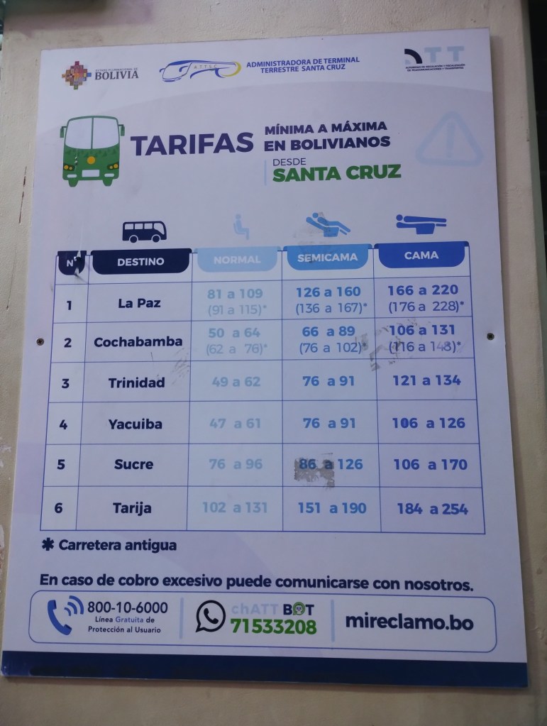 Llego a Santa Cruz a las 6 AM. El viaje en bus desde Yacuiba fue tranquilo, pude dormir casi todo el trayecto. Llueve. Camino un poco por la terminal para hacer tiempo, pretendo ir caminando desde allí al hostel pero me parece que no es recomendable hacerlo de madrugada. La estación se llama Bimodal y entiendo que es porque llegan y salen no solo buses sino también trenes. Hay millones de empresas que van a todos los puntos del país y la mayoría está cerrada por la hora. De todas maneras hay muchas abiertas vendiendo a grito pelado «cocha, Cochabamba». Aprovecho para averiguar el tiempo de viaje a Tarija y el precio. La única empresa abierta me dice que son 14 horas y 200 bolivianos. Me parece mucho. Empiezo a pensar que, si en vez de ir a Tarija, mejor voy a otra ciudad. Capaz Potosí. Veo un cartel con tarifario (lo cual me parece excelente) con todos los precios desde las ciudades principales a las demás como para tener referencia.