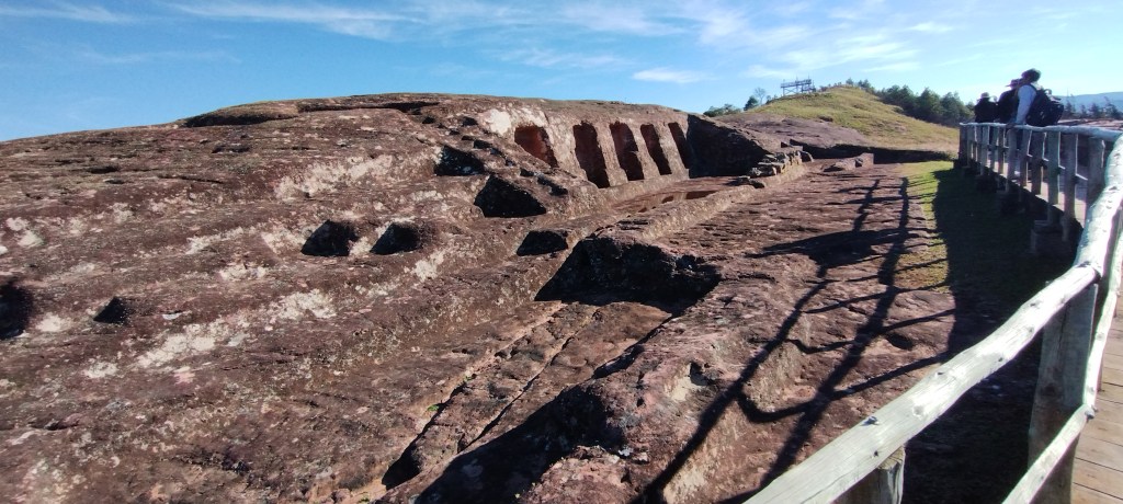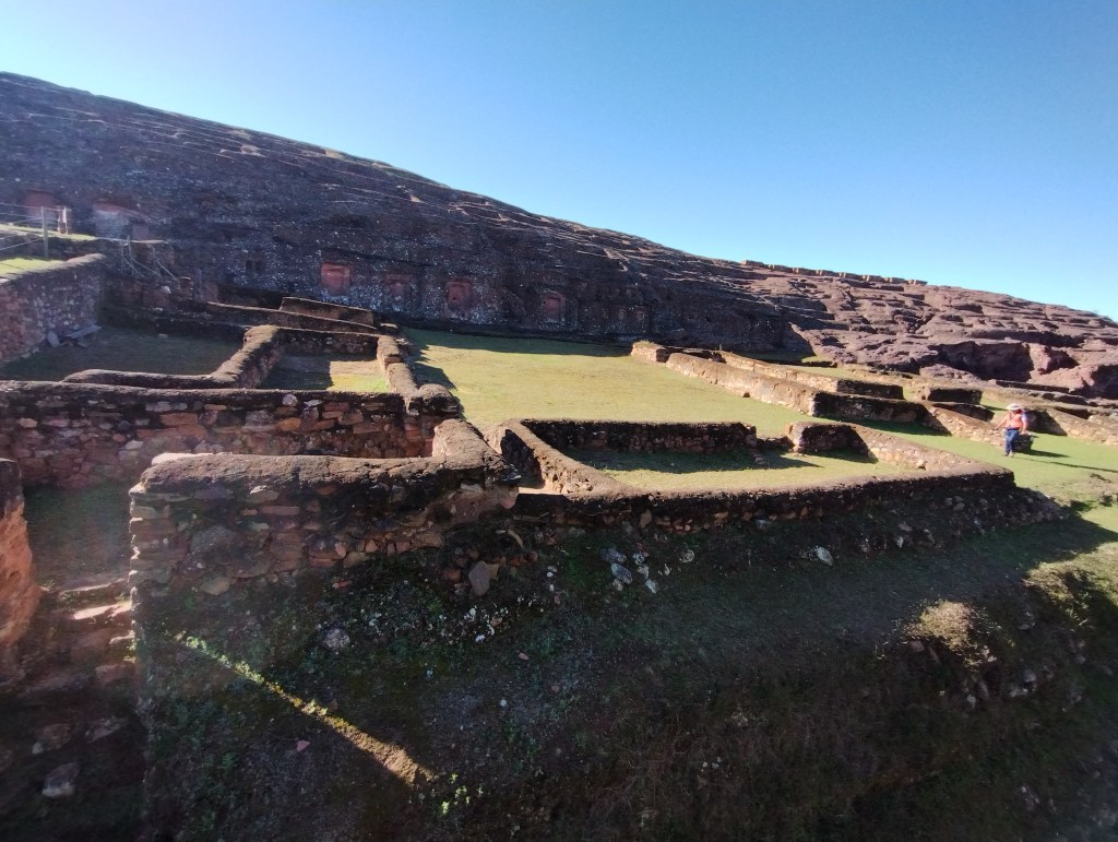 Previo a llegar al parque el conductor me señala una de las paredes de la montaña donde ya se puede ver la salida rocosa de lo que es la continuidad de la gran roca que contiene las ruinas arqueológicas. El Fuerte de Samaipata es un sitio arqueológico precolombino y preincaico de origen chané. Es considerada la piedra tallada más grande al menos de Sudamérica. Caminar por este circuito te lleva mas de una hora y si tenes tiempo y ganas, podes optar por sumar un guía que te va explicando paso a paso lo referente al significado e investigaciones sobre el sitio.